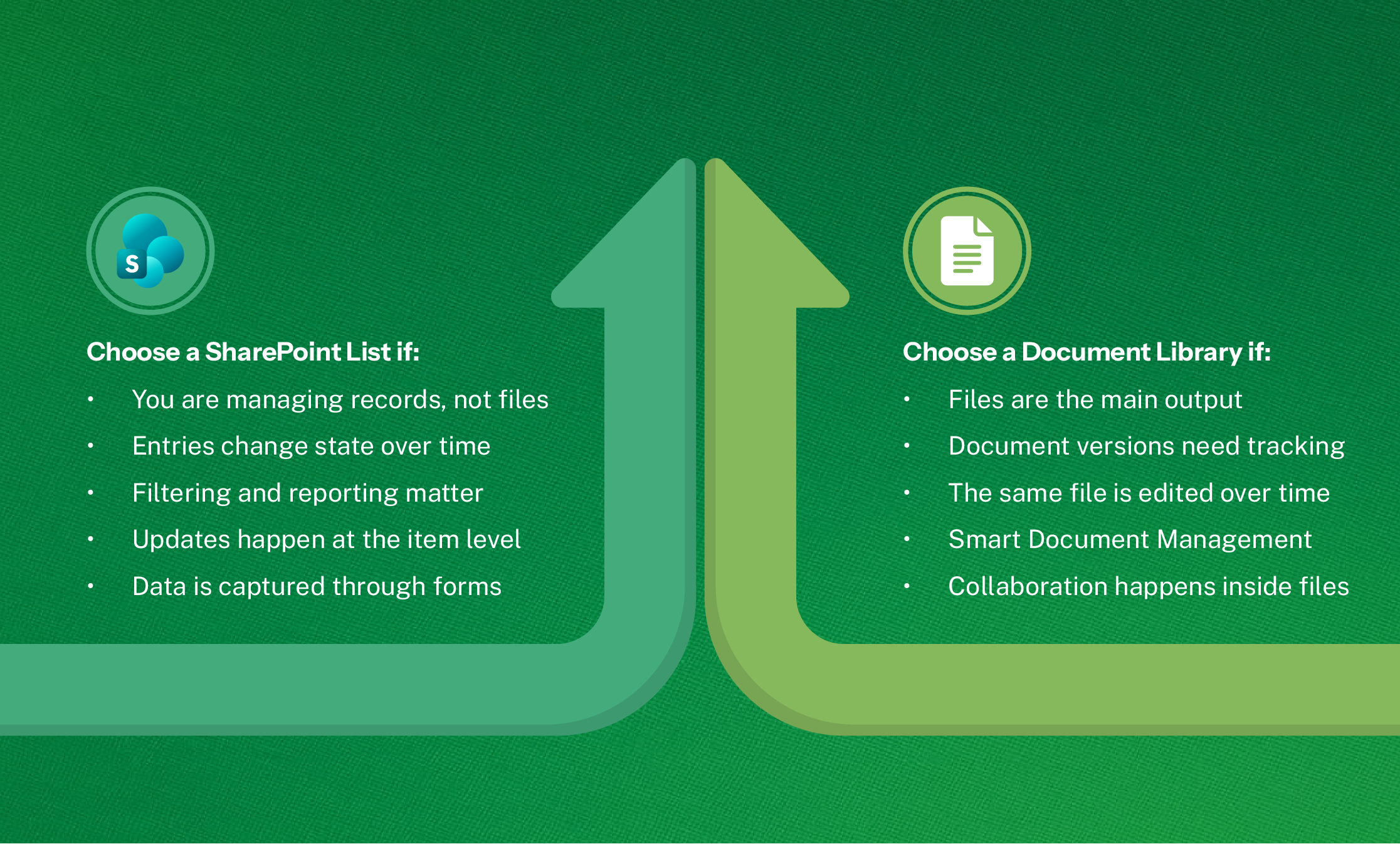 A SharePoint list is used to manage records stored in rows and columns, such as requests, tasks, or registers, where each entry is updated independently over time. A SharePoint document library is used to store and manage files, such as reports, policies, or project documents, where version history and collaboration are important. The choice depends on whether you are managing records or files.