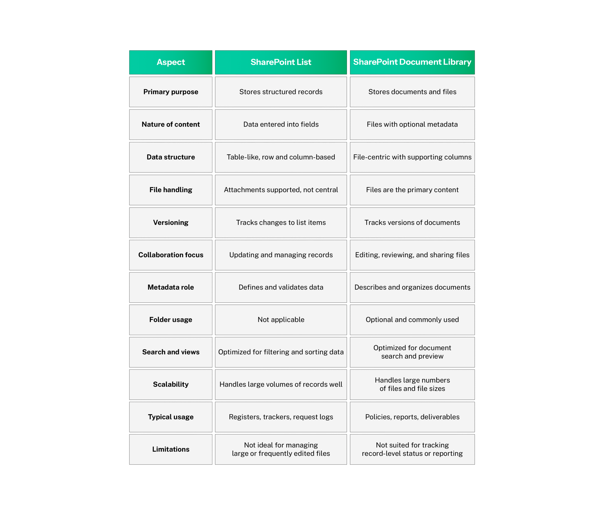 Keep lists focused on records and libraries focused on files. Use metadata instead of deep folders, plan permissions early, and avoid mixing records and documents in one place. This keeps content easier to manage, search, and scale over time.