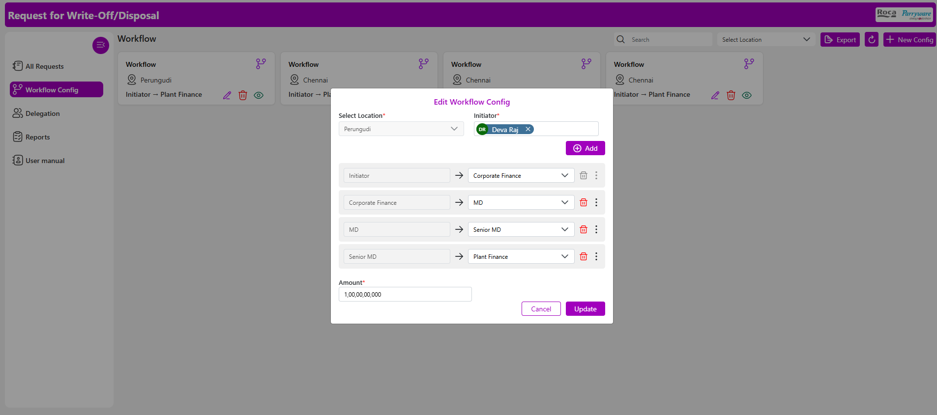 Clear roles define responsibility at every stage. Initiators raise new requests and handle rework when a request is returned. Approvers review and validate requests sequentially. The MD remains the final approver in standard cases, while the Senior MD approval is required when the acquisition cost exceeds ₹1 Cr. Plant Finance completes financial closure after full approval.