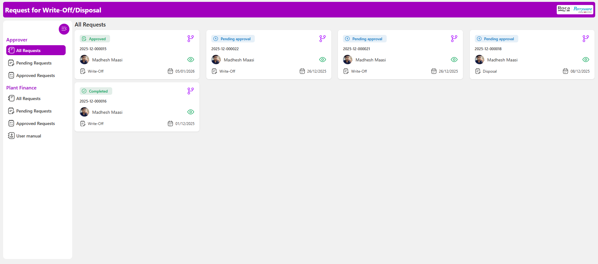 All write-off and disposal requests are tracked centrally with real-time visibility into status, ownership, and pending actions. Stakeholders always know where a request stands and who is responsible.